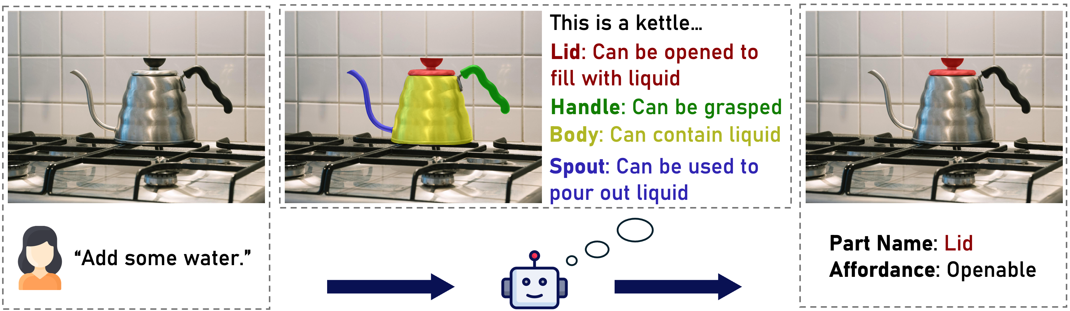 InstructPart dataset: InstructPart dataset comprises of 2,400 images across 48 object classes and 44 part classes, with hand-labeled segmentation masks, as well as 9,600 hand-labeled task instructions, 2,400 part queries, and 2,400 affordances. We split the dataset into 1,800 images for training and 600 images for evaluation.